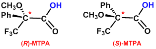 NMR 技术是获的化合物结构的首选方法,其耦合常数和NOE谱图是获取化合物相对构型的重要手段,适用于刚性结构非对映体的构型确认。但是对于光学(对映)异构体而言,一般情况下其NMR谱的信号是相同的,即应用NMR 谱无法直接将其区分,也不能确定其绝对构型。近年来发展了一些间接方法,借助NMR法,通过手性样品的衍生物来测定对映异构体的绝对构型。