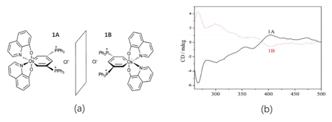 (a)1A和1B的化学结构;(b)1A和1B的CD谱实测值;