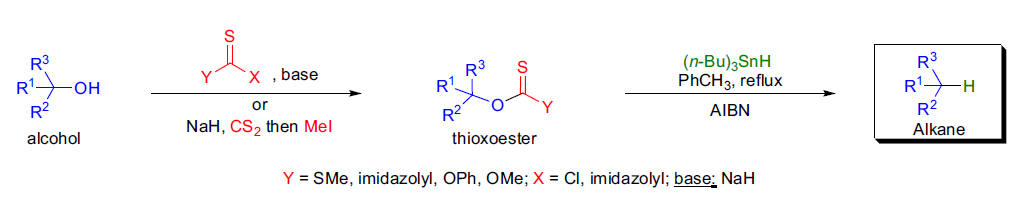 将醇转化为硫代酯类中间体,然后自由基断裂得到醇的脱羟基产物的反应,称为Barton-McCombie脱羟基反应