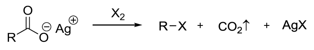 1939年,H. Hunsdiecker报道了干燥的脂肪羧酸银和溴反应可以得到少一个碳原子的溴代烷烃。脂肪羧酸,α,β-不饱和羧酸和特定的芳基甲酸进行脱羧卤代得到少一个碳原子的卤代烷烃的反应被称为Hunsdiecker反应。