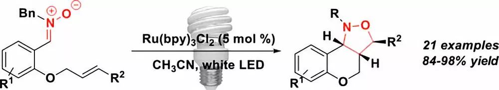 光照条件下,Ru(bpy)3Cl2催化烯基苯基硝酮,进行分子内的偶极环加成反应。