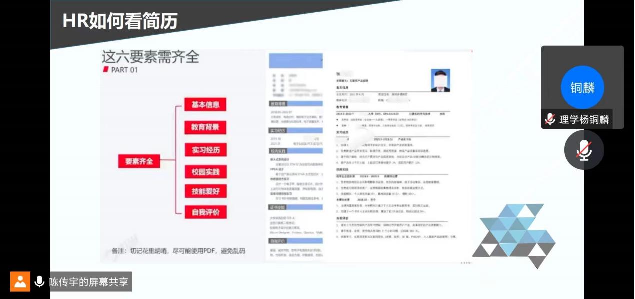 接下来,陈传宇老师将简历的布局细分为六个模块,并就此逐项举例进行细致讲解,介绍如何突出自身亮点,展现核心内容,并提醒同学们要注重细节。