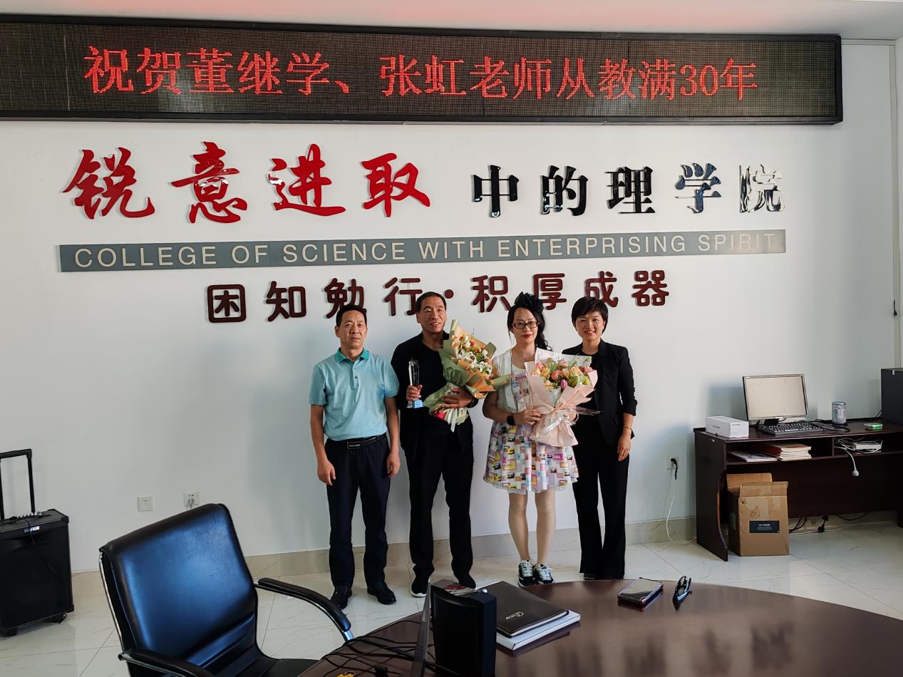 为表达对从教满30年教师几十年如一日、深耕教育事业的感谢,为青年教师树立榜样,学院党委书记刘丽及学院院长冯世德代表学院向从教满30年教师——公共数学教研室教师董继学、张虹献礼。